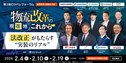 「働く」に関する社会課題をビジネスで解決するキャムコムグループの株式会社ロジテック(以下ロジテック、本社:東京都港区、代表取締役:縄田崇)は、2026年2月4日(水)、10日(火)、19日(木)に第2回ロジパレフォーラム「物流改革の現在地とこれから 法改正がもたらす“実装のリアル”」を開催します。