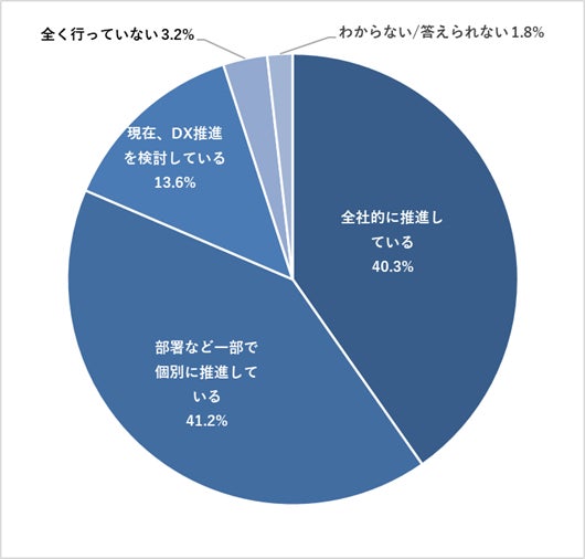 回答者の81.5%(「全社的に推進」40.3%、「部署など一部で推進」41.2%)がDXに着手しており、DXが企業規模を問わず一般的な経営課題として認識されている現状がうかがえます。しかし、「全社的推進」と「部署ごとの推進」がほぼ同率である点は注目すべき点です。これは、トップダウンで統一された戦略の下でDXが進められている企業と、現場主導でボトムアップ的あるいは部分的にDXが進められている企業に分かれている状況があると言えます。
