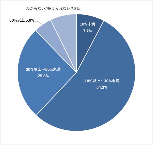 IT予算のうち、新規ビジネス創出などに充てられる「攻めのIT投資」の割合が「30%未満」である企業が62.0%(「10%未満」7.7%、「10%以上~30%未満」54.3%)に達し、多くを占めています。これは、前述の設問の回答で示されたDXの目的が「守りの効率化」に偏っていることと関連していると考えられます。