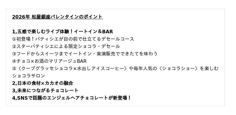 松屋銀座では、2026年2月4日(水)―14日(土)、8階イベントスクエアで「GINZAバレンタインワールド」を開催します。今回のテーマは「五感で楽しむカカオ」。できたてのデザートを楽しめるイートインや、お酒とのマリアージュを味わえるBARカウンターなど、その場で見て、感じて、味わえる「食体験」をブラッシュアップ。特に今年は、パティシエが目の前で一皿ずつ仕立てる「デセールコース」が初登場し、臨場感あふれるライブステージをお届けします。また、日本の素材×カカオの新たな可能性を探求するショコラや、未来へつなぐサステナブルな取り組みを行うブランドの商品など、多彩な切り口でカカオの魅力をご紹介します。