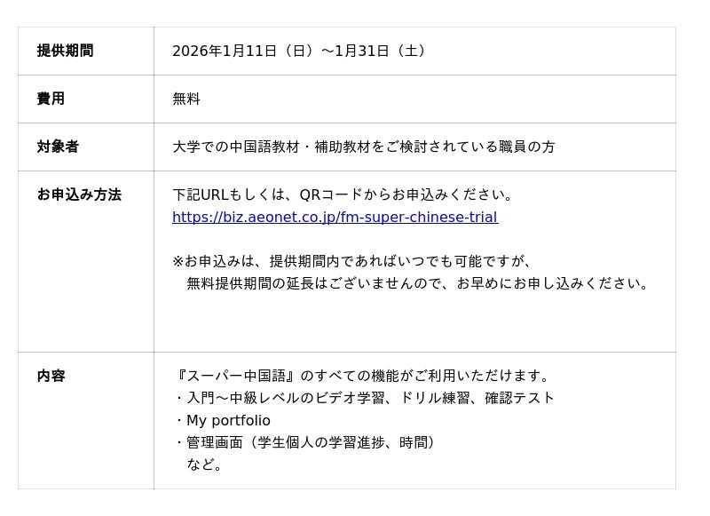 株式会社イーオン、ハオ中国語アカデミーの中国語eラーニング『スーパー中国語』の無料おためし版を大学教務/研修ご担当者様向けに2026年1月11日(日)より期間限定で提供