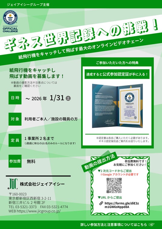 ジェイアイシーグループ(日本全国に展開する障害福祉業界に特化した保険代理店)は、全国の福祉施設や特別支援学校をつなぐ象徴的なチャレンジとして、紙飛行機リレーによるギネス世界記録(TM)「紙飛行機をキャッチして飛ばす最大のオンラインビデオチェーン」(英語名:Largest online video chain of people catching and throwing paper aircraft)への挑戦プロジェクトを開始しています。