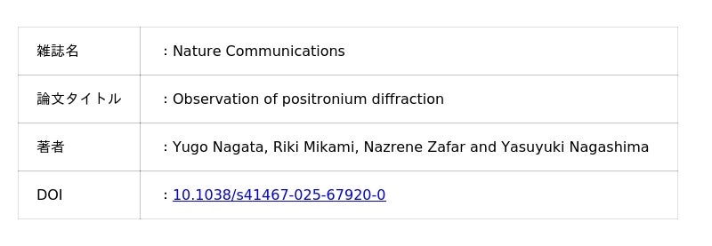 電子と陽電子からなる中性粒子、ポジトロニウムの回折現象を世界で初めて観測 ~ポジトロニウム量子干渉実験の第一歩~