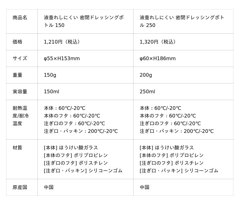 1~2人分の少量使いには150ml、家族で使うなら250mlと、ライフスタイルに合わせてお選びいただけます。