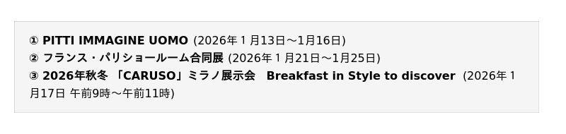 昨年2025年のイタリアのメンズ見本市「PITTI IMMAGINE UOMO(ピッティ・イマージネ・ウオモ)」の初出展で得た手応えを活かし、今年も「PITTI IMMAGINE UOMO」での「J∞クオリティー・ファクトリーブランド・プロジェクト」ブースへゲストブランドとして出展、そして新たにフランス・パリのショールーム「Showroom NU」での合同展参加、さらにイタリアの名門メンズテーラードブランド「CARUSO(カルーゾ)」とのコラボレーションコートがイタリア・ミラノでの2026年秋冬「CARUSO」の展示会で展示され、「CARUSO」によるプレゼンテーションでも紹介される予定です。