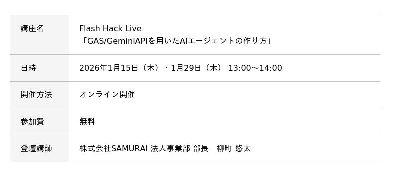 企業のDX支援およびIT教育を展開する株式会社SAMURAI(本社:東京都港区、代表取締役:羽田吾立)は、2026年1月15日(木)および1月29日(木)の2日程にて、Google Apps Script(GAS)とGemini APIを組み合わせたAIエージェント開発を学ぶオンラインセミナーを開催いたします。