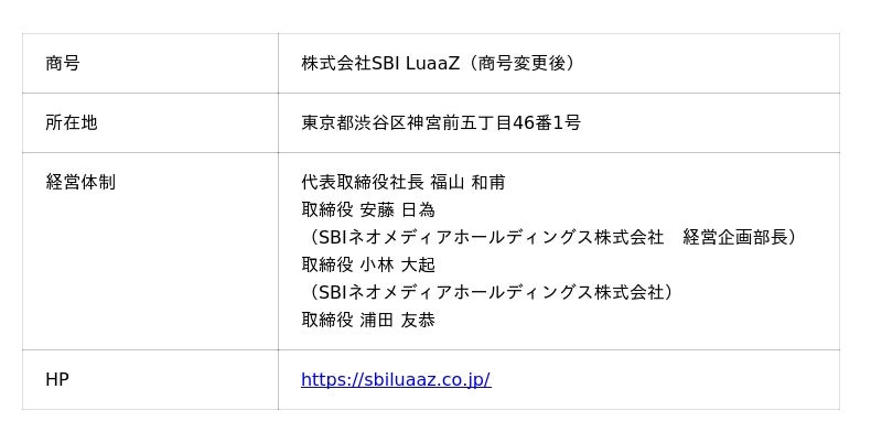 株式会社LuaaZ(本社:東京都渋谷区、代表取締役:福山 和甫、以下「当社」)は、全発行済株式について、当社株主とSBIホールディングス株式会社(本社:東京都港区、代表取締役会長兼社長:北尾 吉孝、以下「SBIホールディングス」)との間で株式譲渡契約が締結されましたので、下記のとおりお知らせいたします。