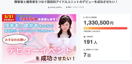 障害者と健常者をつなぐ『インクルージョンアイドルユニット』デビューイベント応援クラウドファンディング5日で目標金額達成!ネクストゴールへ挑戦!3/31まで