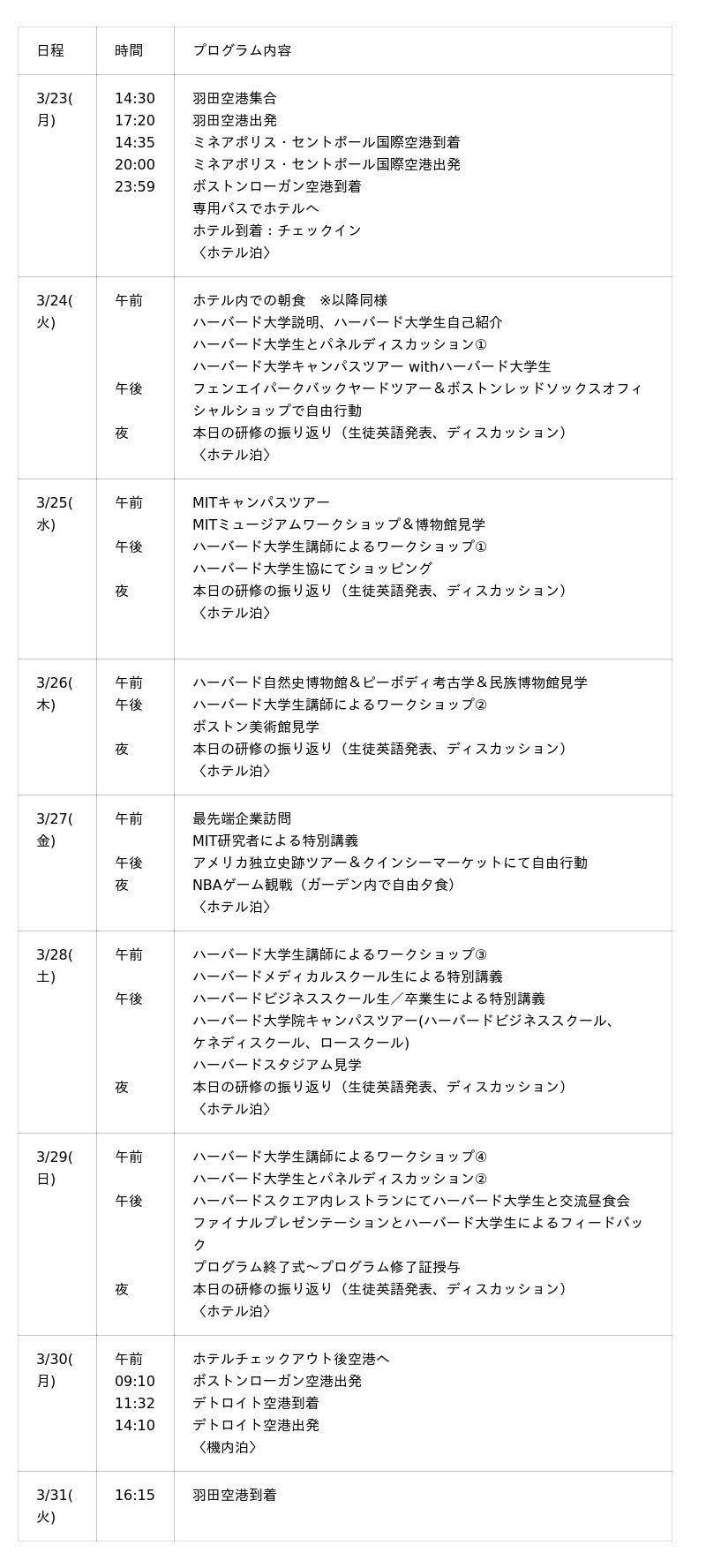 【日程】2026年3月23日(月)~3月31日(火) 【対象】新中学1年生~現高校3年生 【開催地】アメリカ・ボストン 【申込締切】2026年2月5日(木)18:00