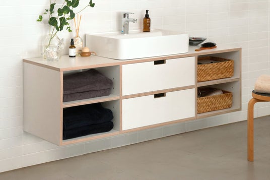 素材:ラトビアバーチ合板(洗面台)、陶器(洗面器)