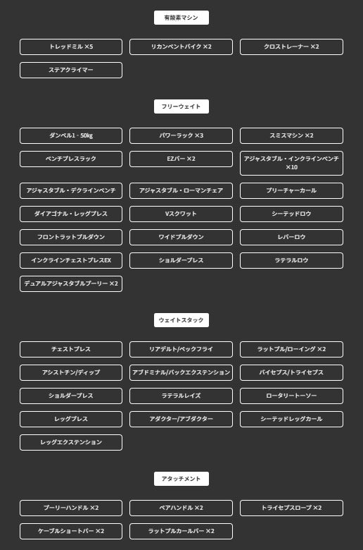 初心者向けの有酸素マシンから、上級者向けのフリーウェイトまで、幅広いトレーニングに対応しています。