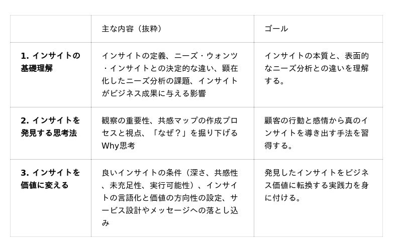 - 発見した洞察を具体的な商品やサービスの改善に活用できる展開力を習得します。