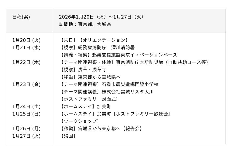 外務省が推進する対日理解促進交流プログラム「JENESYS」の一環として、救急・防災・ビジネス・起業交流をテーマに、東ティモールから社会人8名が下記の日程で東京都および宮城県を訪問します。