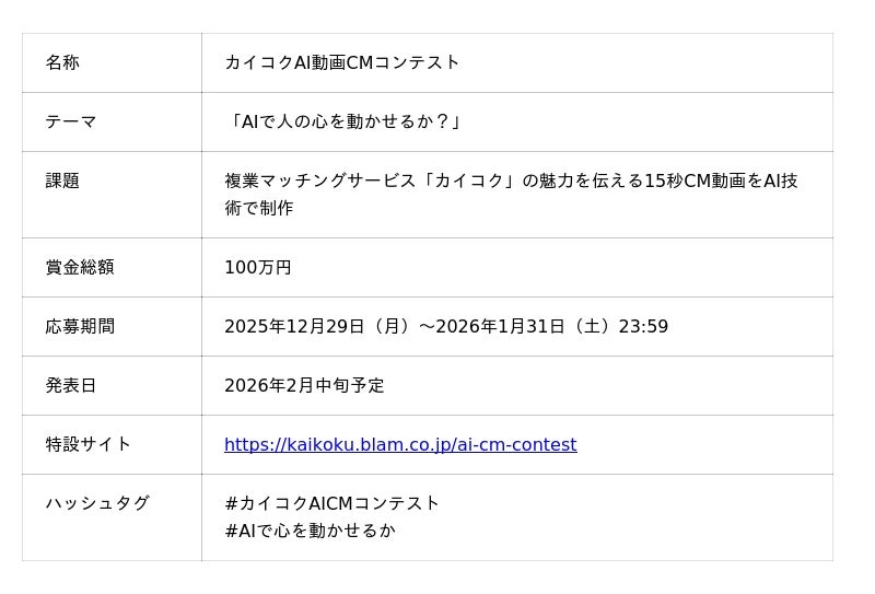 株式会社BLAM(本社:東京都品川区、代表取締役社長 兼 CEO:杉生遊、以下「BLAM」)は、舞台アーティスト / タレントの芋洗坂係長とタッグを組み、AI技術を活用した15秒CM動画コンテスト「カイコクAI動画CMコンテスト」を2025年12月29日(月)より開催しました。これに伴い、本コンテストの作品を評価する「企業審査員」の募集を開始いたします。応募フォームはこちら。
