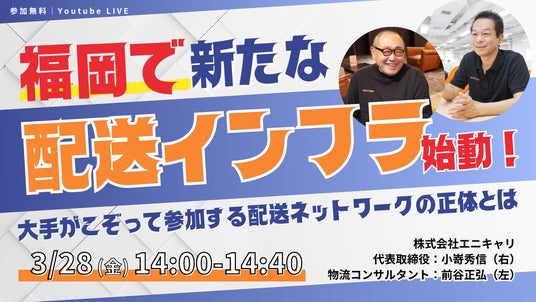 ラストマイル物流に特化した物流ソリューション事業を展開する株式会社エニキャリ(以下エニキャリ)は、「福岡で新たな配送インフラ始動!~大手がこぞって参加する配送インフラの正体とは~」と題して、3月28日(金)14時より、YouTubeでライブ配信を行うことをお知らせします。