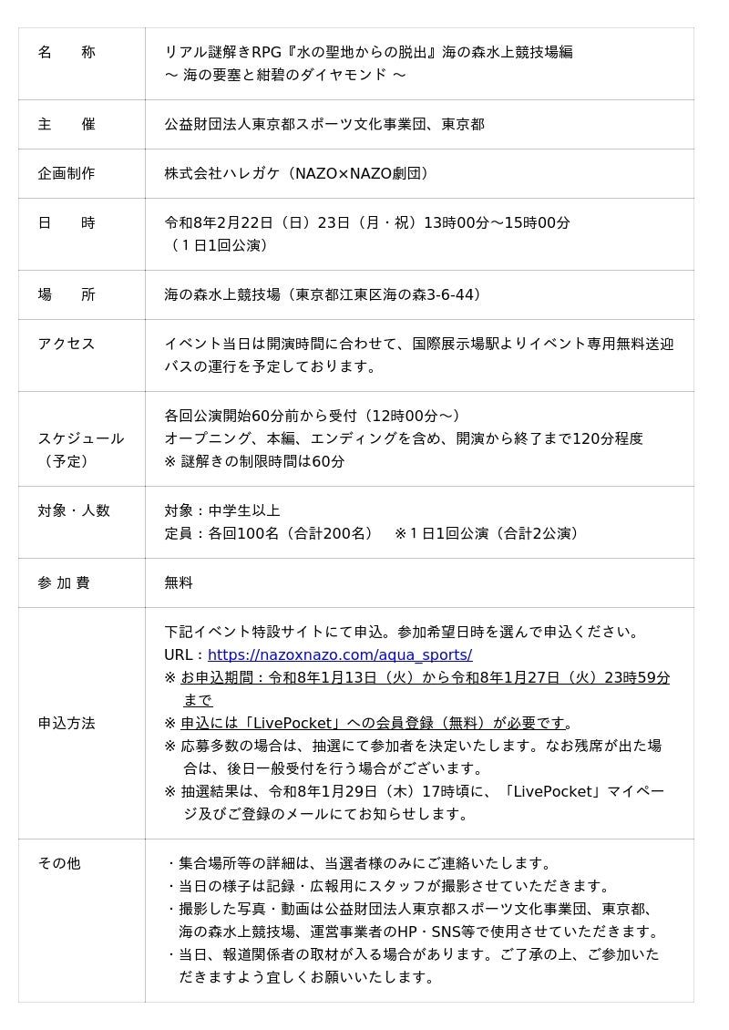 リアル謎解きRPG第2弾は、東京2020大会のローイング、カヌー(スプリント)会場となった、「海の森水上競技場」(江東区)で、令和8年2月22日(日曜日)、23日(月曜日・祝日)の2日間開催します(各日1公演の全2公演/参加費無料)。「海の森水上競技場」は、水上に広がる開放的なロケーションで、東京湾の素晴らしい眺めとドラマチックな都市景観を一度に楽しむことができる魅力的な施設です。