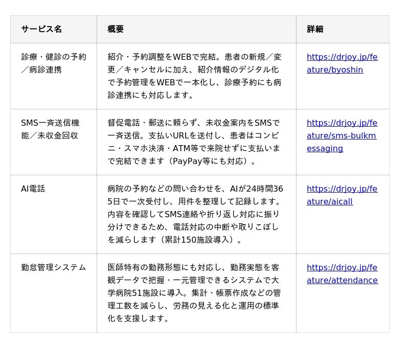 本サービスは、政府の令和7年度補正予算案に盛り込まれている補助等も踏まえ、病院の状況に応じた各種補助金の活用に向けた準備をサポートしながら、診療・健診の予約/病診連携、SMS一斉送信/未収金回収支援、AI電話、勤怠管理などの当社サービスの導入を支援するものです。