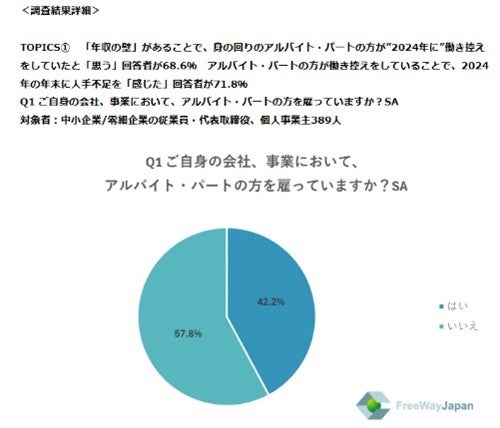 TOPICS1. 「年収の壁」があることで、身の回りのアルバイト・パートの方が”2024年に”働き控えをしていたと「思う」回答者が68.6% アルバイト・パートの方が働き控えをしていることで、2024年の年末に人手不足を「感じた」回答者が71.8%