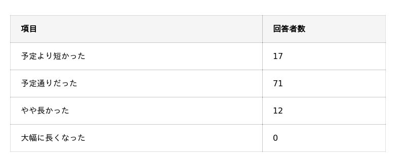 - 作業時間は7割が時間通りに完了し、2割近くが予定よりも短い時間で作業完了している。