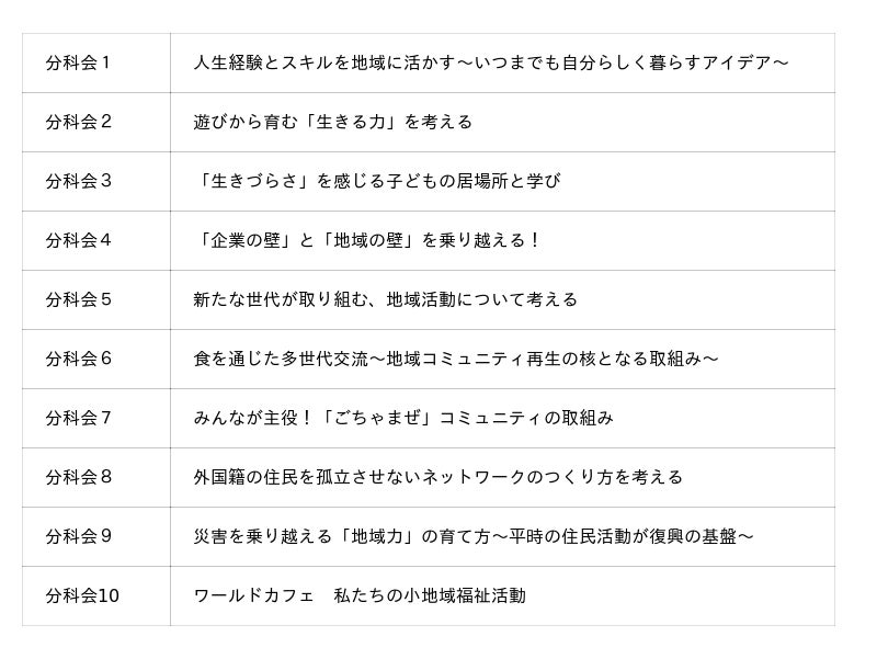 豊島区をはじめ、石川県輪島市、静岡県、千葉県市原市、神奈川県川崎市、北区、杉並区、中野区等で活動されている地域福祉団体の皆さまが各分科会にて活動報告をします。