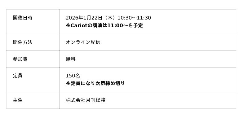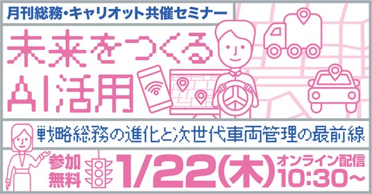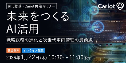株式会社キャリオット(本社:東京都港区、代表取締役社長 齋藤 洋徳)は、株式会社月刊総務(本社:東京都千代田区、代表取締役社長 豊田 健一)が開催する、オンラインセミナー「未来をつくるAI活用 戦略総務の進化と次世代車両管理の最前線」に登壇します。
