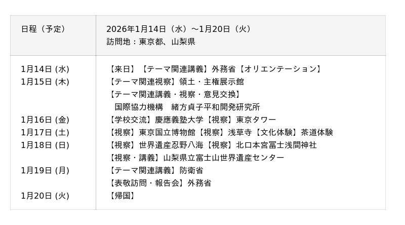慶應義塾大学では、同世代の学生や教員との知的交流を行い、外交・安全保障をテーマにしたワークショップや意見交換を通じて相互理解を促進します。これにより、欧州諸国と日本の将来のリーダーたちのネットワークを構築し、友情を育みます。また、山梨県では、雄大な富士山や富士山世界遺産センターを視察し、日本の自然や文化への関心を高めます。