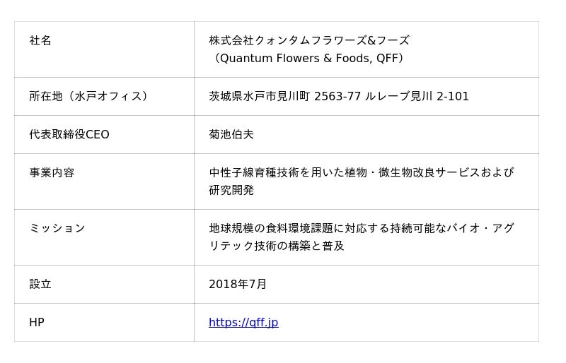 株式会社クォンタムフラワーズ&フーズ(本社:茨城県水戸市、代表取締役CEO:菊池伯夫、以下「QFF」)は、2026年1月19日(月)に港区立産業振興センターで開催される「第4回 港区オープンイノベーションフェア FOOD INNOVATION CIRCLE 2025」に参加いたします。