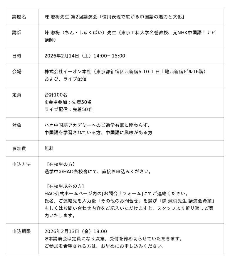株式会社イーオン(本社:東京都新宿区、代表取締役社長:重野卓、以下「イーオン」)が運営するハオ中国語アカデミーは、2026年2月14日(土)に東京工科大学名誉教授、元NHK中国語!ナビ講師で、中国語教育の第一人者である陳 淑梅先生をお迎えし、第2回講演会「慣用表現で広がる中国語の魅力と文化」を開催いたします。