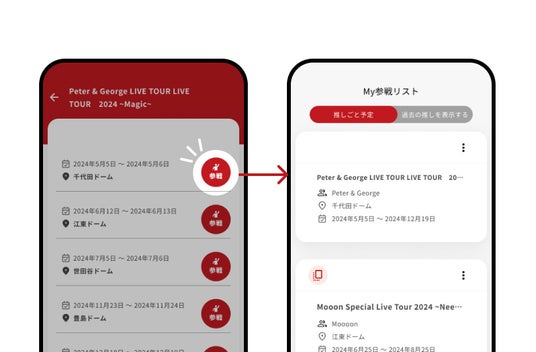 2.参戦履歴管理自分のライブ・イベントへの参戦予定を「My参戦リスト」として一覧管理。推し活スケジュールの管理が簡単にできるようになります!使い続けることで、参戦履歴データも溜まっていきます。