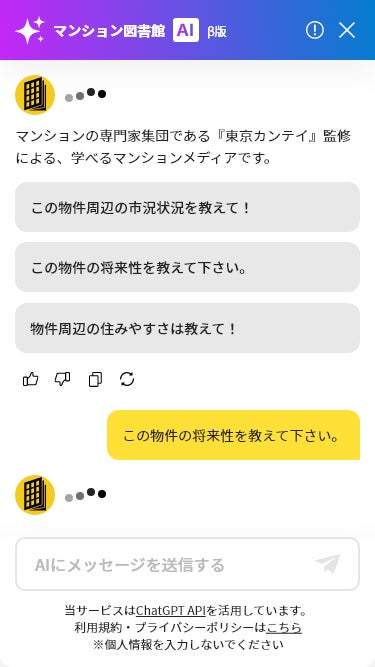 「マンション図書館AI(β版)」は、正式版リリースに向けた試験提供の段階であり、回答内容の精度および網羅性には限界がある場合があります。