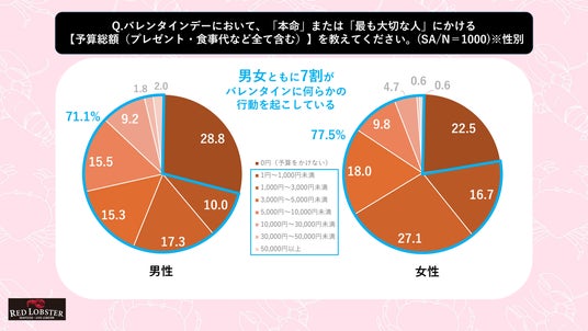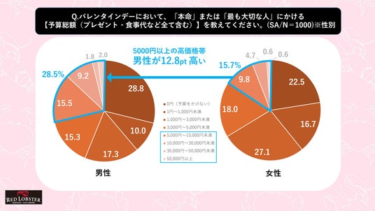 さらに「5,000円以上」の高価格帯を選んだ人の割合は、女性が15.7%だったのに対して男性は28.5%という結果になりました。このことから、男性の予算は「0円(予算をかけない)派」と「5,000円以上かける高価格帯派」に分かれており、バレンタインデーの向き合い方に広がりがある様子が見て取れます。
