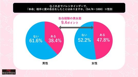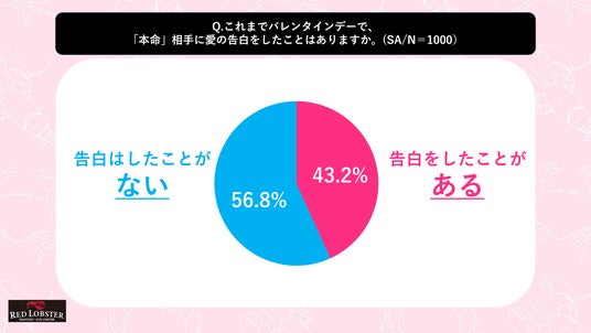 『これまでバレンタインデーで、「本命」相手に愛の告白をしたことがある人』の割合は43.2%に留まり、告白をしたことがない派のほうが過半数を占めることが分かりました。性別に見ると、告白したことがある人の割合が女性は47.8%、男性は38.4%となり、バレンタインデーの告白経験の男女差は9.4ポイントに留まることが明らかになりました。