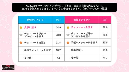 『2026年のバレンタインデーに「本命」または「最も大切な人」に気持ちを伝えるとしたら、どのように告白するか』という問いに対し、男性は「食事に誘う」を選ぶ人が最多で44.9%、女性は「チョコレートを渡す」で52%という結果になりました。