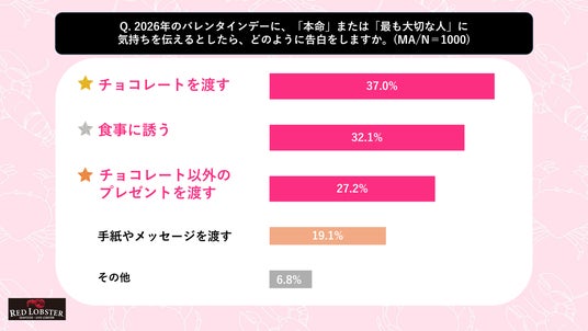 全体で見ると「チョコレートを渡す」(37.0%)と「食事に誘う」(32.1%)が上位でした。これまでの告白方法についての設問では両者には6.7ポイントの差がありましたが、2026年に気持ちを伝える手段としては4.9ポイント差に迫りました。