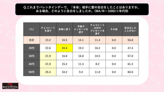 告白の手段について年代別に見ると、30代~50代は「チョコレートを渡す」が最多だったのに対して、20代は「食事に誘う」が最多で4人に1人が選んでおり、世代間の傾向の違いが明確になりました。これらのことから「バレンタインに女性から男性にチョコレートを贈る習慣」が変化しつつあることが見受けられます。