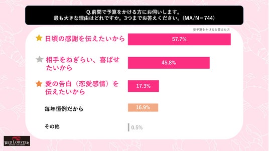『バレンタインデーにおいて「本命」または「最も大切な人」にかける予算総額(プレゼント・食事代などすべて含む)』を1円以上と回答した人に対して『予算をかける最も大きな理由』を質問したところ、最も多かったのは『日頃の感謝を伝えたいから』で57.7%となりました。これにより、全年代でバレンタインデーの動機は「恋愛感情」よりも「感謝・ねぎらい」が上回っていることが裏付けられました。