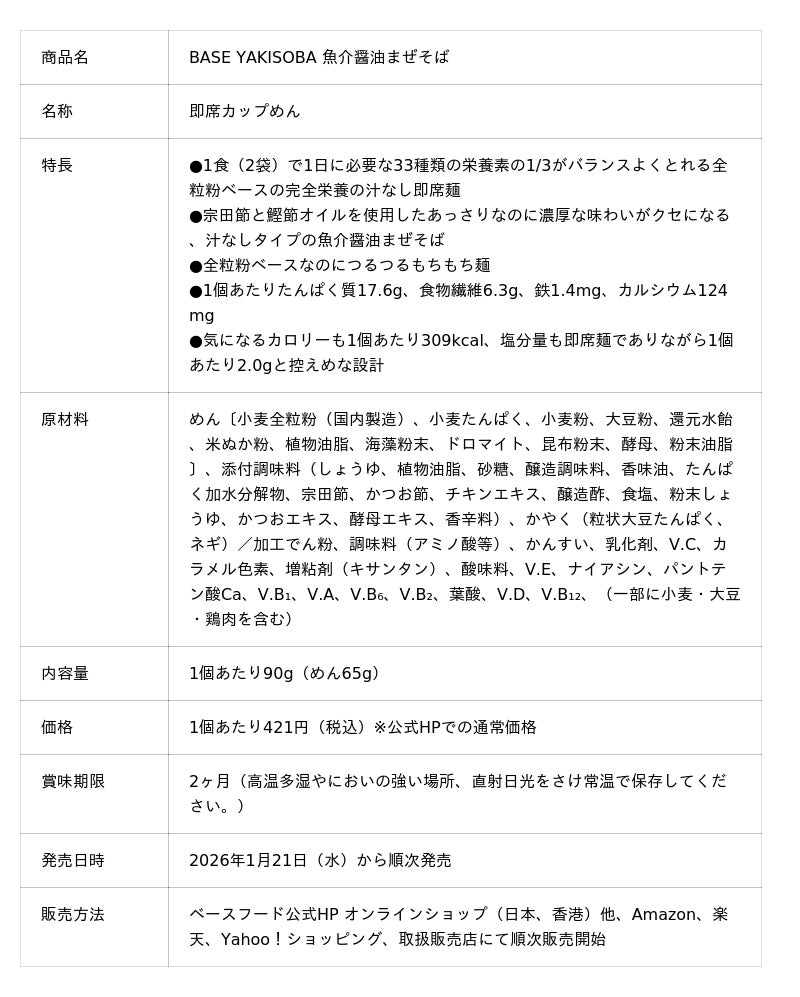完全栄養の主食※1等を開発・販売するベースフード株式会社(本社:東京都目黒区、代表取締役:橋本舜、https://basefood.co.jp)は、1食に必要な33種類の栄養素がすべて摂れる全粒粉ベースの完全栄養の即席麺※2「BASE YAKISOBA(ベースヤキソバ)」シリーズから、「BASE YAKISOBA 魚介醤油まぜそば」を2026年1月21日(水)より公式オンラインショップ(https://shop.basefood.co.jp/)、他ECサイト、取扱販売店にて順次販売開始します。