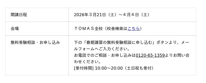 株式会社リソー教育グループ(本社:東京都豊島区、代表取締役:天坊真彦)の子会社である、株式会社TOMAS(本社:東京都豊島区、代表取締役:町田仁)は、2026年3月21日(土)より、「完全1対1個別指導 春期講習」を開講します。