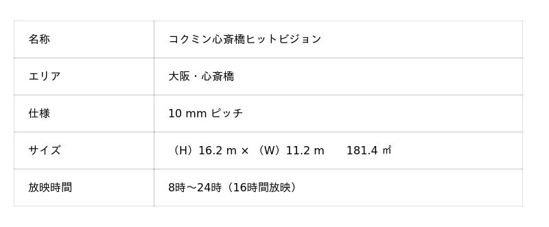 『コクミン心斎橋ヒットビジョン』は、大阪ミナミエリアの中でも有数の繁華街である心斎橋にて2015年4月より稼働している、約180平方メートル のサイズを誇る縦型の大型デジタルサイネージです。心斎橋筋商店街の北側(長堀通沿い)に位置し、地元住民から観光客まで多くの歩行者が集まる心斎橋筋商店街からの視認性が高い媒体です。