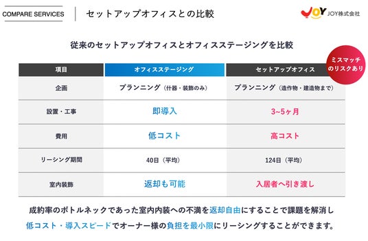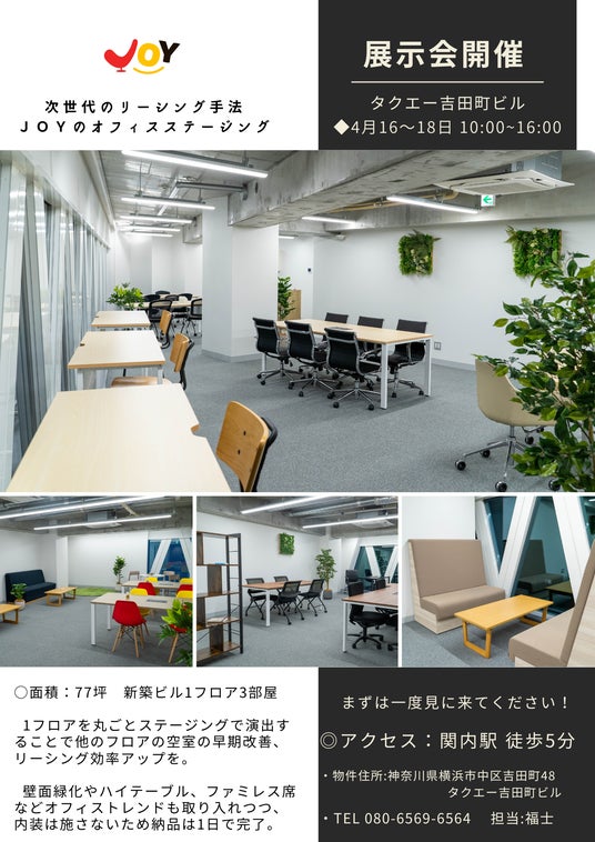 オフィスのモデルルームをつくる「オフィスステージング」サービスを展開する、JOY株式会社(所在地:千葉県船橋市、代表取締役:福士知志)は、リーシング成功事例を体験できる展示会を開催します。