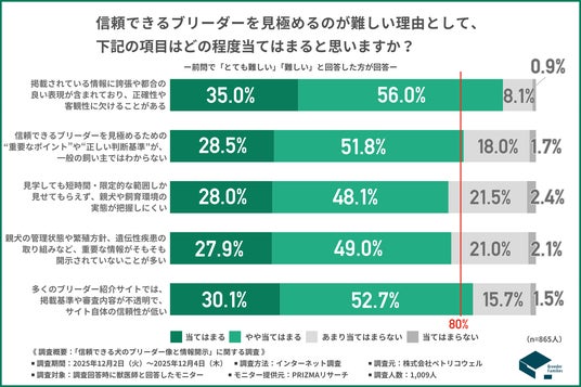 前の質問で『とても難しい』『難しい』と回答した方に、「信頼できるブリーダーを見極めるのが難しい理由として、下記の項目はどの程度当てはまると思いますか?」と質問したところ、『当てはまる』『やや当てはまる』と回答した方の割合は項目別で以下の通りとなりました。