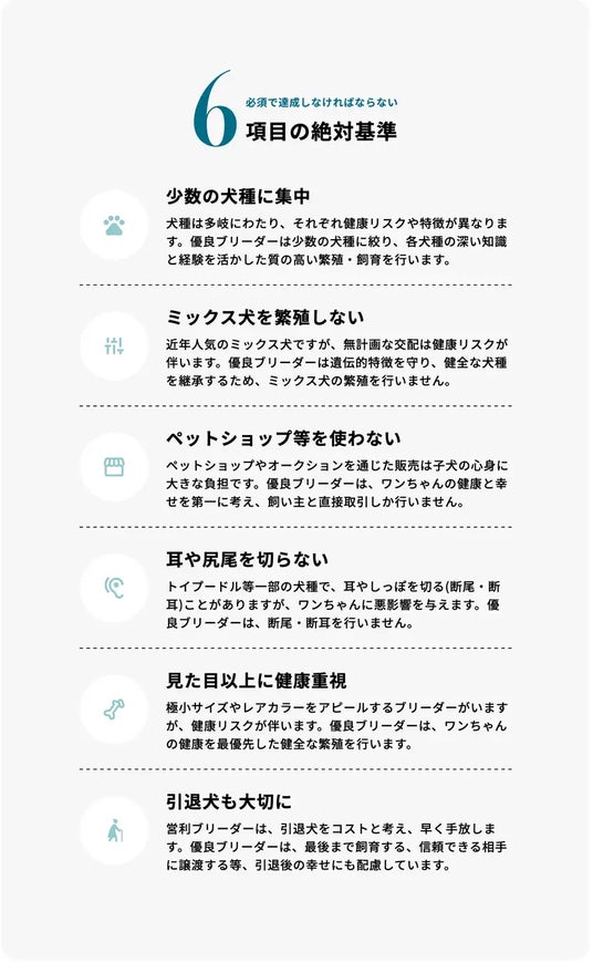 【親犬を大切に扱い、出産回数を自主的に制限し、引退しても安易に手放さない】