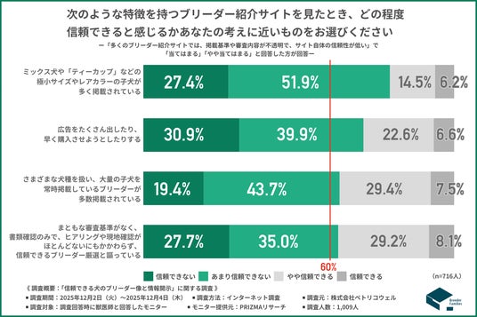 「次のような特徴を持つブリーダー紹介サイトを見たとき、どの程度信頼できると感じるかあなたの考えに近いものをお選びください」と質問したところ、『あまり信頼できない』『信頼できない』と回答した方の割合は項目別で以下の通りとなりました。
