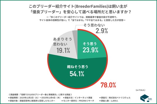 「このブリーダー紹介サイト(BreederFamilies:https://breederfamilies.com/)は飼い主が「優良ブリーダー」を安心して選べる場所だと思いますか?」と質問したところ、約8割が『そう思う(23.9%)』『概ねそう思う(54.1%)』と回答しました。