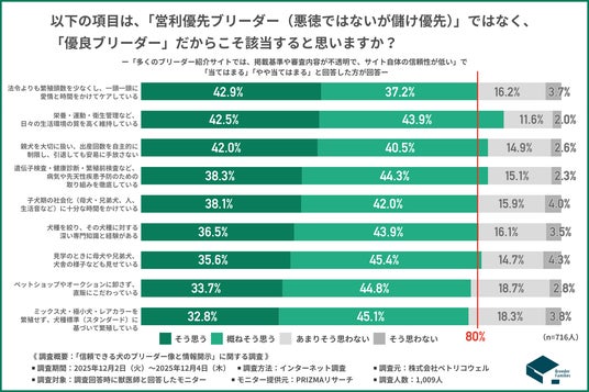 「営利優先ブリーダーではなく、優良ブリーダーだからこそ該当すると思いますか?」と質問したところ、『そう思う』『概ねそう思う』と回答した方の割合は項目別で以下の通りとなりました。