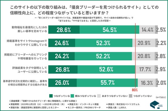 「ブリーダー紹介サイト(BreederFamilies:https://breederfamilies.com/)の以下の取り組みは、「優良ブリーダーを見つけられるサイト」としての信頼性向上に、どの程度つながっていると思いますか?」と質問したところ、『つながっている』『概ねつながっている』と回答した方の割合は項目別で以下の通りとなりました。