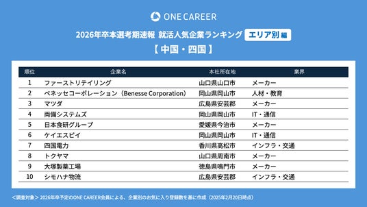 調査名 :就活人気企業ランキング【エリア別編】26卒本選考期速報
