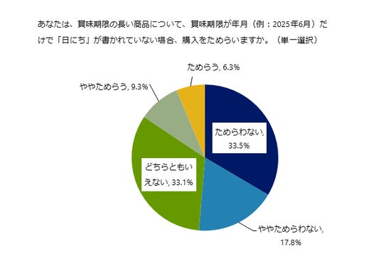 賞味期限で「日にち」が書かれていない場合であっても、「ためらわない」「ややためらわない」を合わせて51.3%であり、過半数が大括り化された賞味期限表示を受け入れていると言えます。一方、「ためらう」「ややためらう」は合わせて2割弱と低いです。