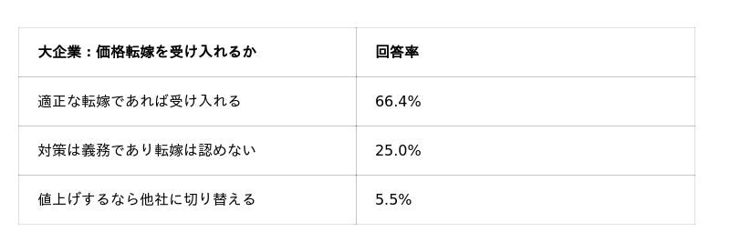 興味深いのは、大企業側の66.4%が「適正な転嫁であれば受け入れる」と回答している点です。