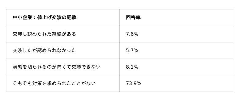 中小企業の8.1%が「契約を切られるのが怖くて交渉できない」と回答しています。